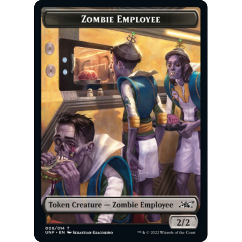 Set: Unfinity Tokens Type: Token Creature Zombie Employee Rarity: Common Zombie EmployeeFood2, T, Sacrifice this artifact: You gain 3 life. Reverse Type: Token Artifact Food {2}, {T}, Sacrifice this artifact: You gain 3 life.